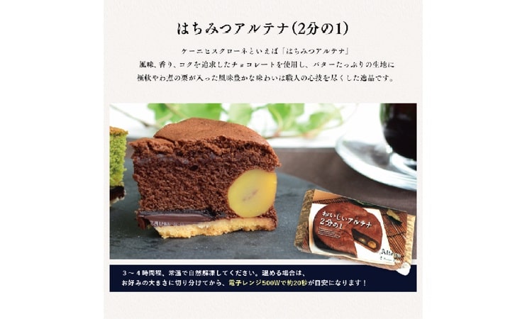 ケーニヒスクローネだけの美味しさ。風味、香り、コクを追求したチョコレートを使用し、フレッシュバターたっぷりの生地に極軟煮の栗が入った上品な味わい。ちょうど良い食べきりサイズ。