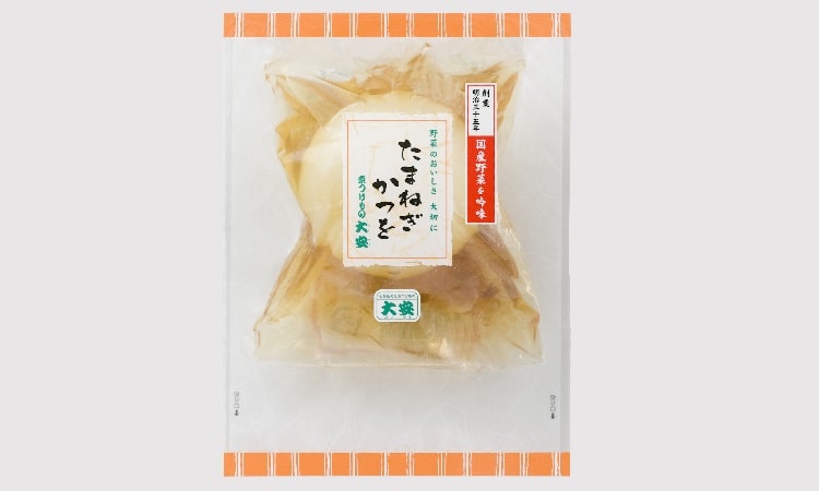 姿のままのたまねぎを、かつおと醤油の旨味をきかせただしでじっくりと漬け込んでいます。花かつおを加えて味わいに深みを持たせました。ご飯のおともだけでなく、薄切りにしてサラダに 加えてもおいしくお召しあがりいただけます。