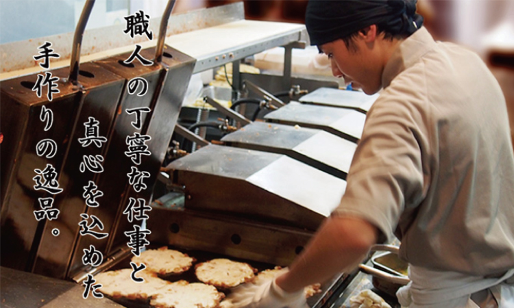 大阪の味“いか焼き”はイカの姿焼きではなく、大阪の食文化と言われる“粉もん”の1つ。秘伝のダシとこだわりの小麦粉、歯ごたえのあるカットしたイカを練り合わせ、上下高温の専用鉄板で挟んで一気 に焼き上げます。それに控えめに特製ソースを塗って完成。シンプルな食材・調理ですが、生地はモチモチ。口いっぱいに旨味が広がり、香ばしいソースの味がクセになります。