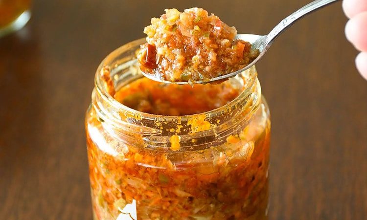 日本人の野菜摂取量を上げるために、パンや白ごはんなどの主食にかけて食べる「レリッシュ(みじん切りピクルス)」です。