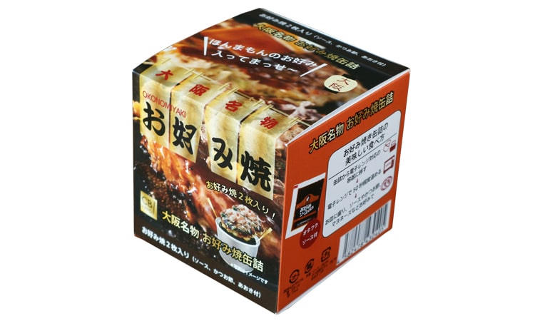 大阪粉もん文化の一つ、お好み焼き缶。箱の中の缶詰にお好み焼きが2枚と別添えでソース、かつお、あおさが入ってます。温めてソースなどをかけると本格小型お好み焼きの完成です。