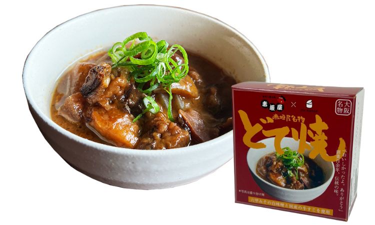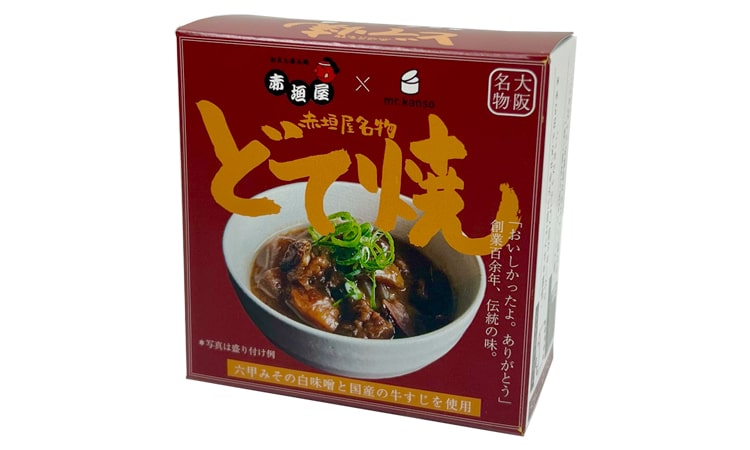 大阪老舗の立ち飲み屋「赤垣屋」100周年記念のコラボレート商品。お店で長く愛されつづけたどて焼きを缶詰に。国産牛すじとこんにゃく、大根を六甲みそでじっくり煮込んでとろとろに。お好みで七味唐辛子などが合います。