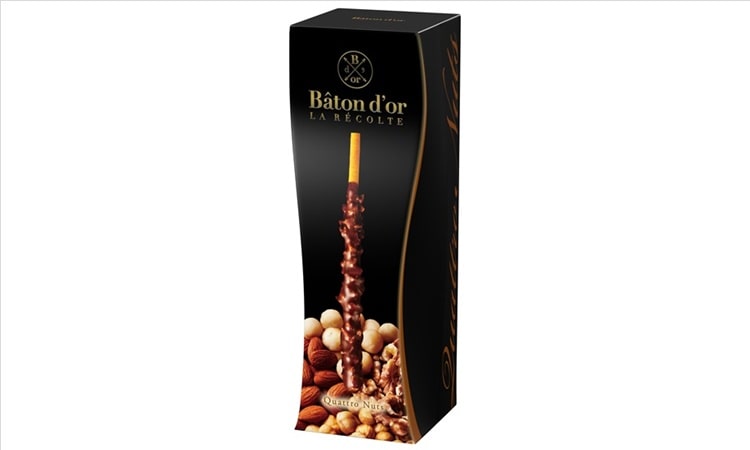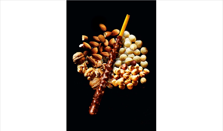 澄ましバターをしみ込ませたバターリッチプレッツェルにアーモンドとヘーゼルナッツを使ったオリジナルレシピのチョコレートを纏いぎっしりと散りばめたマカダミアナッツとウォルナッツ。