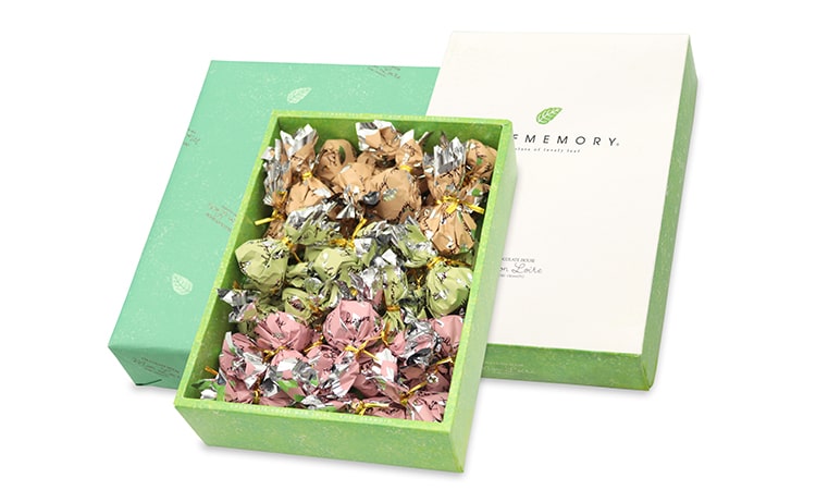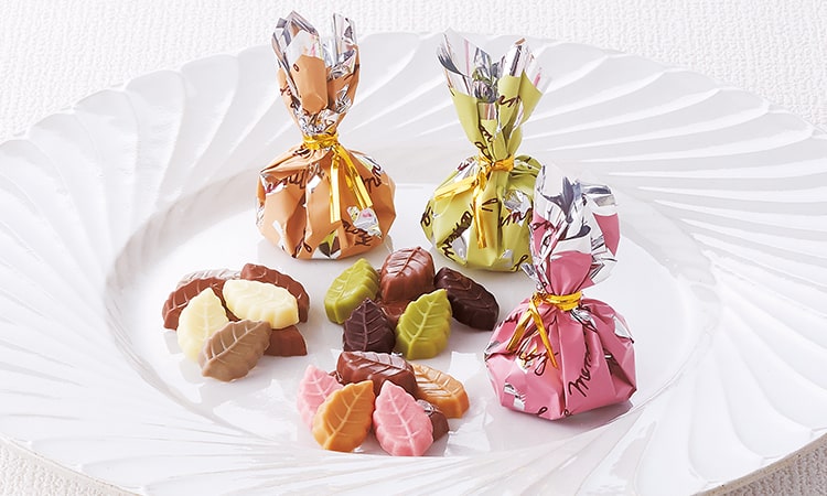 モンロワールの大人気のチョコレートのひとつ“リーフメモリー”が、3色セットになって、BIGなボックスに入りました。取り分けても、摘みあっても、贈られても大丈夫。お好きなように、楽しんでみてください!橙の巾着(ミルク・ホワイト・モカ)、緑の巾着(ダーク・ミルク・抹茶)、桃の巾着(クランベリー・キャラメル・ミルク)の風味。