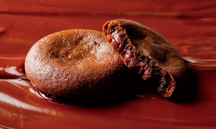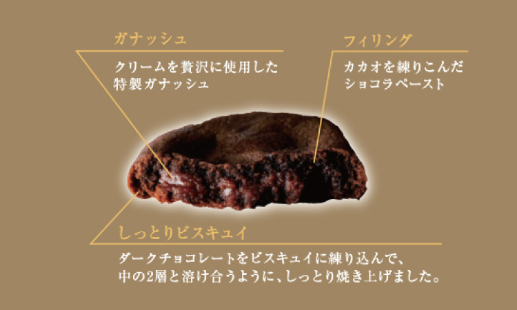 クリームをたっぷり使用したガナッシュ、それを包むカカオを練りこんだショコラペーストのフィリング、そしてダークチョコのビスキュイで包み焼き上げた新しいショコラスイーツをお楽しみください。