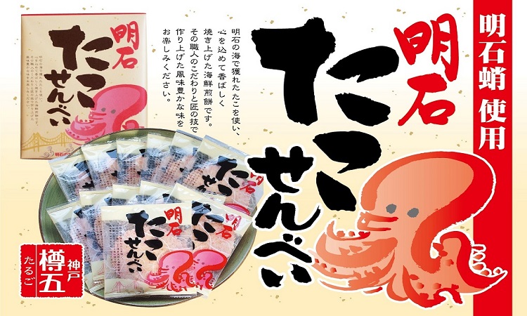 明石の海で獲れたたこを使い、心を込めて香ばしく焼き上げた海鮮煎餅です。 その職人のこだわりと匠の技で作り上げた 風味豊かな味をお楽しみ下さい。