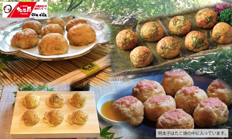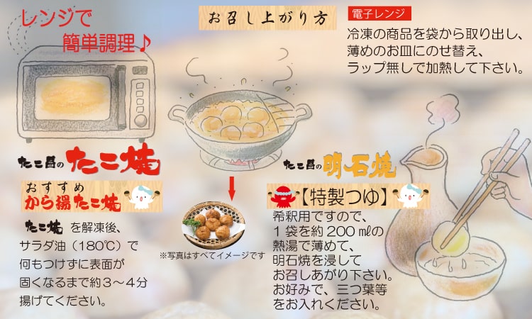 ■内容量:【しょう油味たこ焼】195g(7個入り)【明石焼】170g(6個入り)【京・九条ねぎたこ焼】205g(7個入り)【博多明太子たこ焼】205g(7個入り)【特製ソース】(1袋入り)【つゆ(希釈用)】(1袋入り)