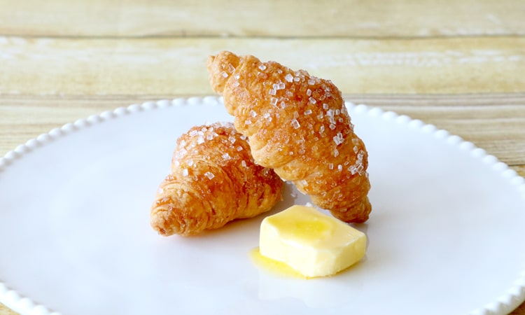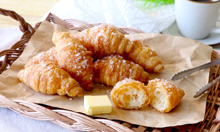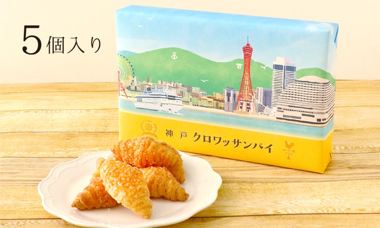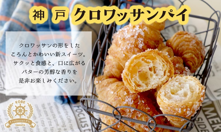 パンの街「神戸」に似合うクロワッサン形のパイです。生地を何度も折り重ねることで生まれたサクサク食感とじゅわっと広がるバターの風味が特徴です。