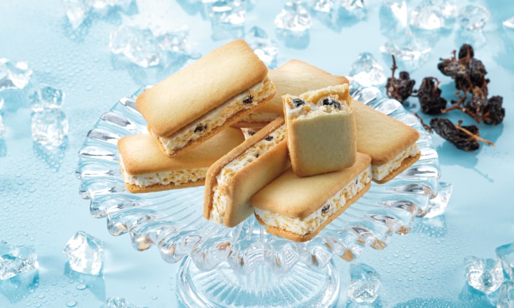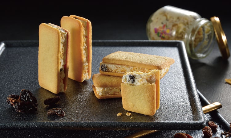 レーズン入りのホワイトチョコを六甲山麓牛乳を使用したバタークッキーでサンドしました。 ざくざく食感の中に酸味のあるレーズン、そしてふんわり香るラムの風味が味に奥行きを与えています。